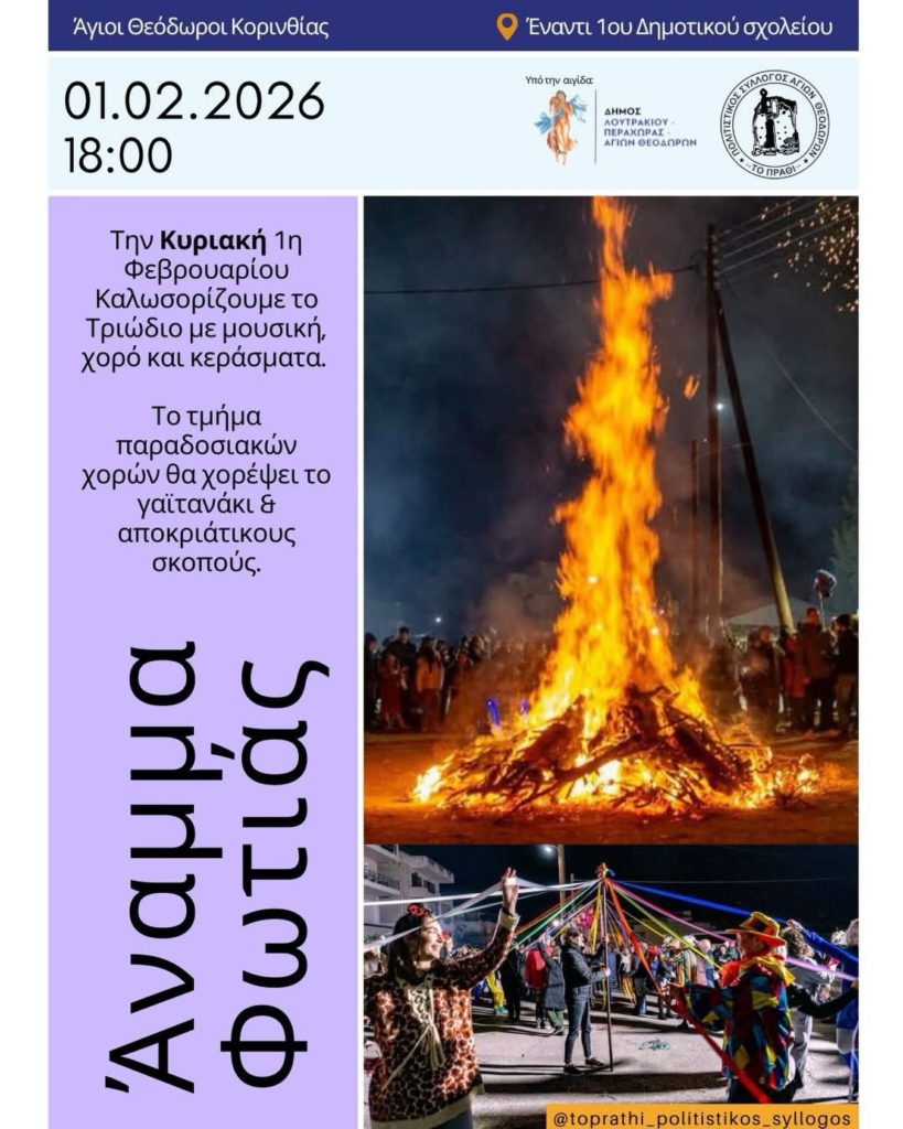 Η εκδήλωση που διοργανώνει ο Πολιτιστικός Σύλλογος ‘Το Πράθι’ Υπό την αιγίδα του Δήμου Λουτρακίου – Περαχώρας – Αγίων Θεοδώρων, θα πραγματοποιηθεί στη διασταύρωση του ταχυδρομείου ΕΛΤΑ και του 1ου δημοτικού σχολείου.