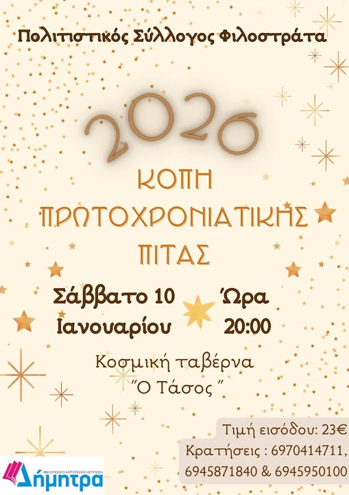 Με ιδιαίτερη χαρά σας προσκαλούμε στην κοπή της πρωτοχρονιάτικης πίτας του συλλόγου μας που θα πραγματοποιηθεί το Σάββατο 10 Ιανουαρίου 2026 και ώρα 20:00 στην κοσμική ταβέρνα “Ο Τάσος”.