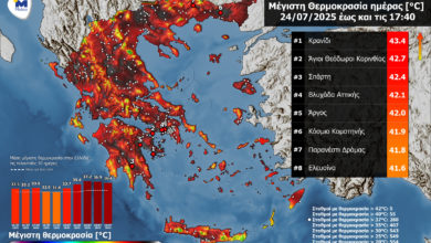 Στους 42°C η μέγιστη θερμοκρασία την Κυριακή 27/07 – 196 σταθμοί με μέγιστη τιμή θερμοκρασίας πάνω από 37°C Συνθήκες καύσωνα…
