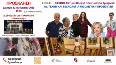 ΔΕΥΤΕΡΑ 12 Ιανουαρίου 2026 – 18:00-23:00 Τρίπτυχο εκδηλώσεων στο Κέντρο Πολιτισμού ΡETROSOPHY, Άγιοι Θεόδωροι Κορινθίας – ΕΚΘΕΣΗ STRING ART+ΠΑΡΟΥΣΙΑΣΗ ΒΙΒΛΙΟΥ+ΠΡΟΒΟΛΗ…