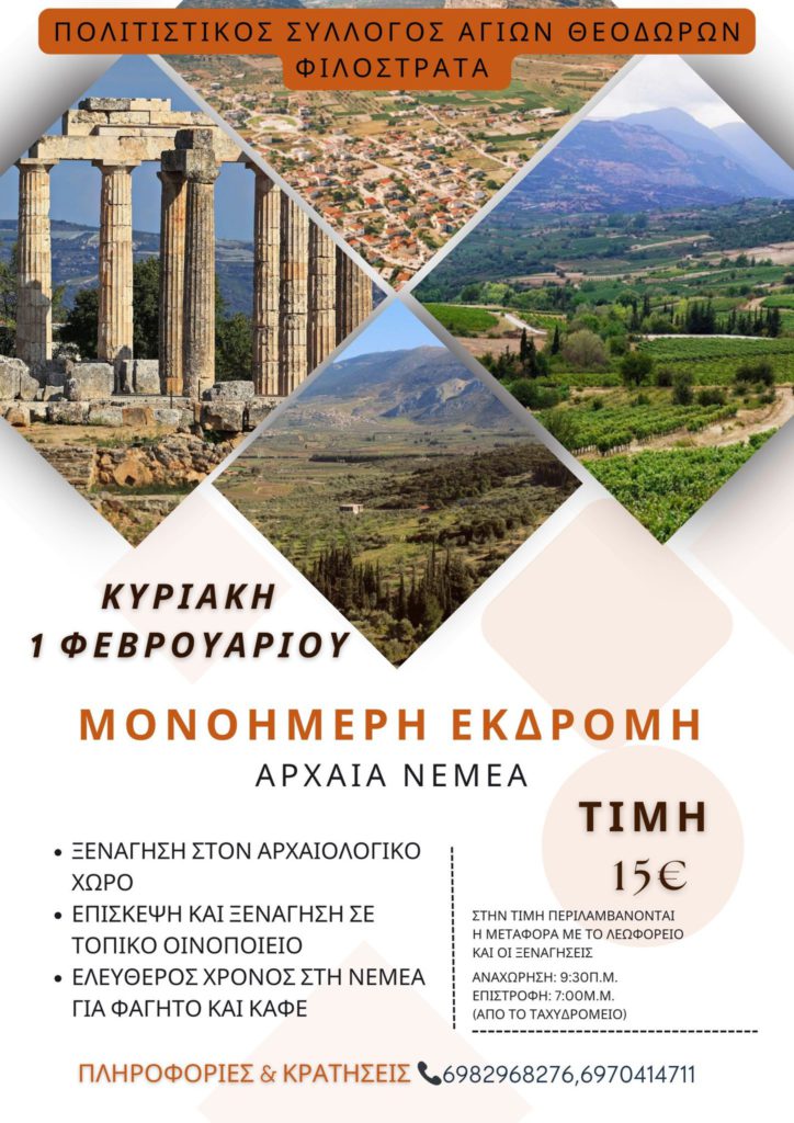 Ο Πολιτιστικός Σύλλογός Φιλοστράτα διοργανώνει μονοήμερη εκδρομή στον αρχαιολογικό χώρο της Αρχαίας Νεμέας, την Κυριακή 1 Φεβρουαρίου 2026, μια ξεχωριστή εμπειρία πολιτισμού και χαλάρωσης