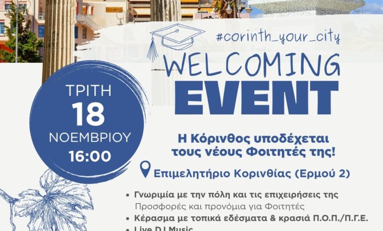 Στο πλαίσιο του Welcoming Event – “Η Κόρινθος υποδέχεται τους νέους φοιτητές της”, που θα πραγματοποιηθεί την Τρίτη 18 Νοεμβρίου 2025, ώρα 16:00, στο Επιμελητήριο Κορινθίας (Ερμού 2), προσκαλούνται οι επιχειρήσεις της πόλης να δηλώσουν συμμετοχή προσφέροντας εκπτώσεις, προνόμια ή ειδικές προσφορές στους φοιτητές των τμημάτων: