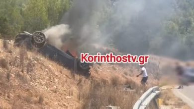 Σοκαριστικό τροχαίο στην Κορινθία – Αυτοκίνητο ανατράπηκε και τυλίχθηκε στις φλόγες