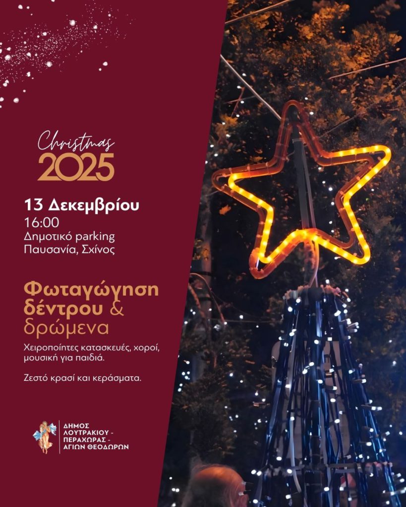 Προσκαλούμε όλα τα παιδιά στο Δημοτικό πάρκινγκ Παυσανία για μια ζεστή, γιορτινή και δημιουργική χριστουγεννιάτικη γιορτή παρέα με τον Εξωραϊστικό & Πολιτιστικό Σύλλογο Σχίνου Κορινθίας «Τα Γεράνεια» !