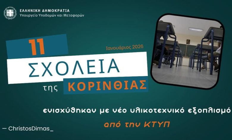 Έντεκα ακόμα σχολεία στην Κορινθία ενισχύονται με ολοκαίνουριο υλικοτεχνικό εξοπλισμό από την ΚΤΥΠ ΑΕ του Υπουργείου Υποδομών και Μεταφορών.