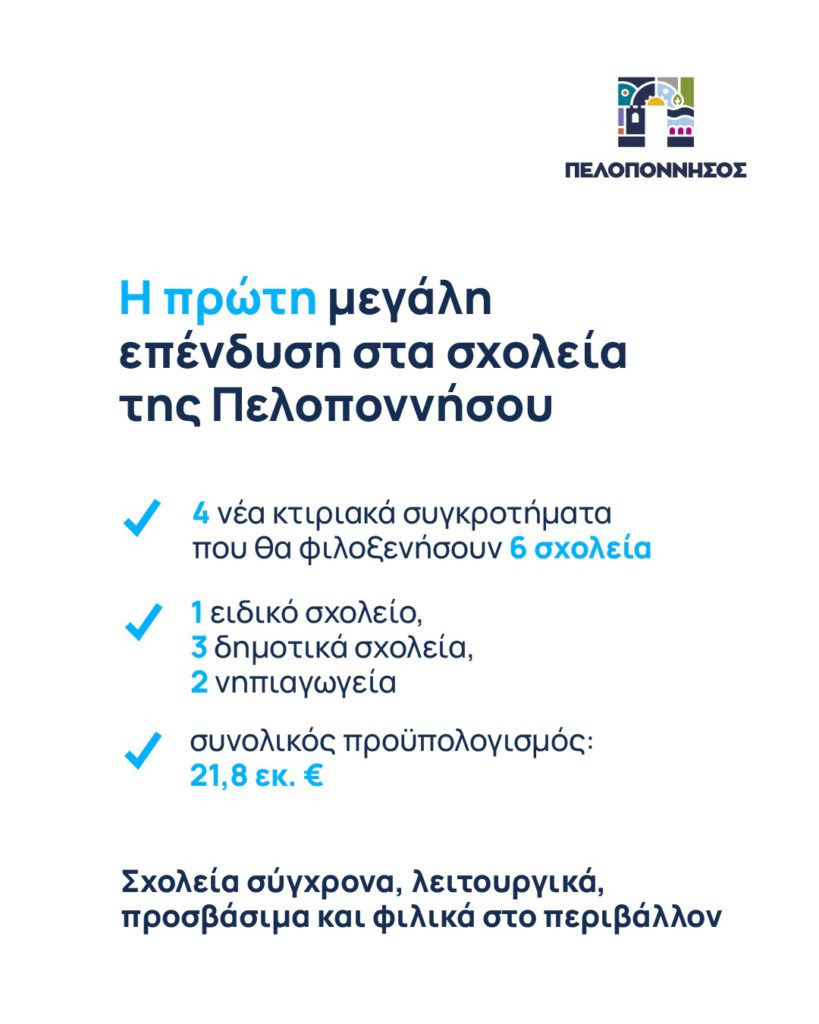 Πρόκειται για έναν νέο κύκλο παρεμβάσεων στις σχολικές υποδομές της Περιφέρειας, μέσω ΕΣΠΑ, που έρχεται να προστεθεί σε έργα, όπως ο Παιδικός Σταθμός Μολάων (1.382.421,64 €) και ο Βρεφονηπιακός Σταθμός Τρίπολης (1.273.555,53 €). Η προσπάθεια συνεχίζεται, καθώς ακολουθούν νέες παρεμβάσεις και ώριμες μελέτες που ενισχύουν συνολικά το εκπαιδευτικό αποτύπωμα της Πελοποννήσου, αξιοποιώντας κάθε διαθέσιμο χρηματοδοτικό εργαλείο.