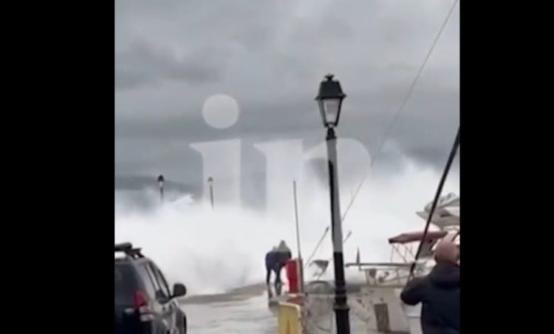 Τεράστια κύματα σκάνε με ορμή στον μόλο και παρασύρουν άνδρες του Λιμενικού μέσα στο λιμάνι