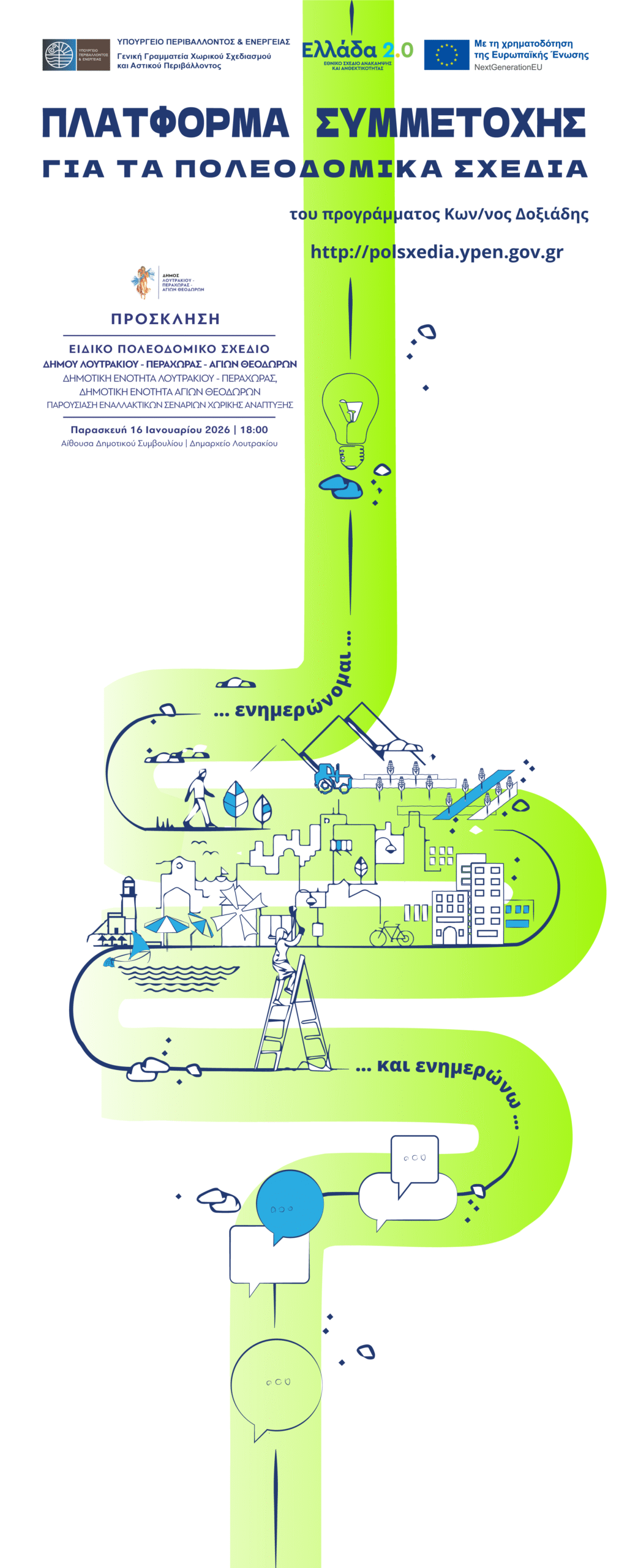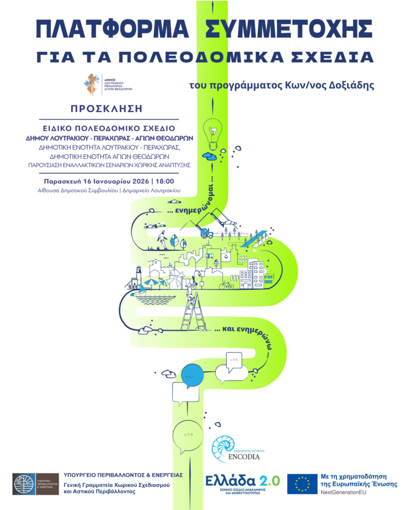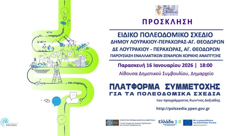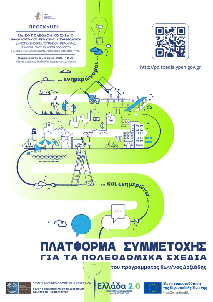 Πρόσκληση στην Παρουσίαση Εναλλακτικών Σεναρίων Χωρικής Ανάπτυξης – Ειδικό Πολεοδομικό Σχέδιο Δήμου Λουτρακίου – Περαχώρας – Αγίων Θεοδώρων
