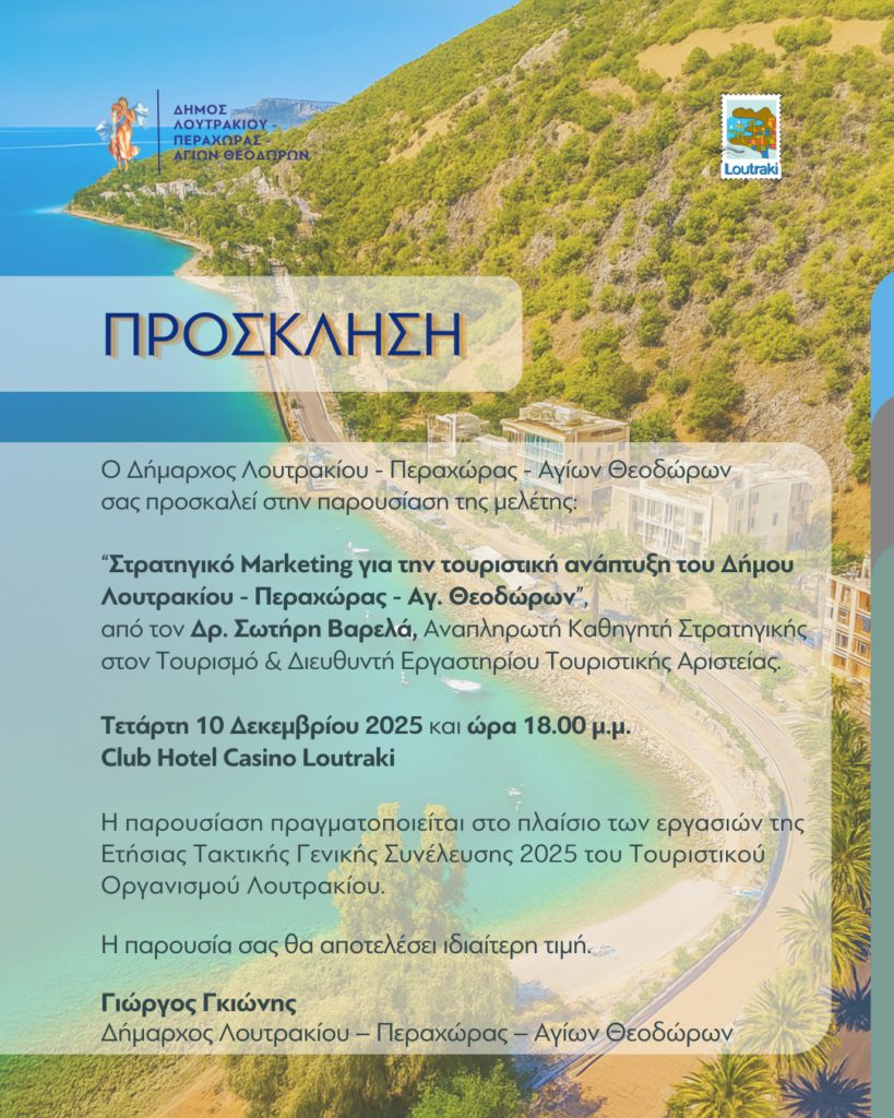 “Στρατηγικό Marketing για την τουριστική ανάπτυξη του Δήμου Λουτρακίου – Περαχώρας – Αγ. Θεοδώρων”, από τον Δρ. Σωτήρη Βαρελά, Αναπληρωτή Καθηγητή Στρατηγικής στον Τουρισμό & Διευθυντή Εργαστηρίου Τουριστικής Αριστείας.