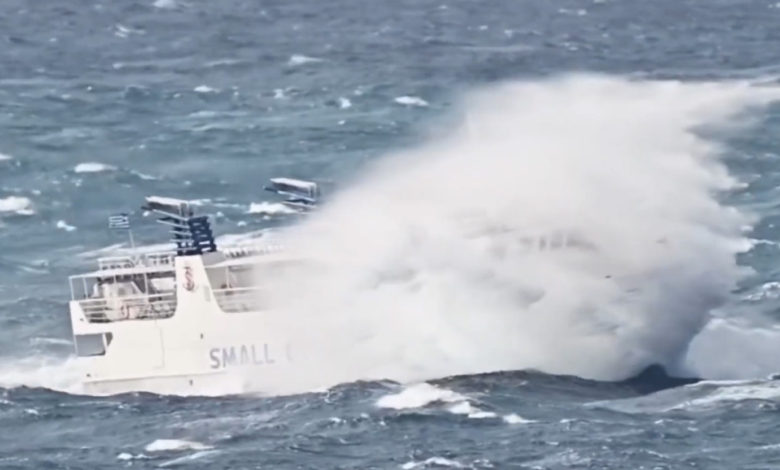 Εντυπωσιακές είναι οι εικόνες που κατέγραψε η κάμερα και δείχνουν τον «Σκοπελίτη» να πλέει εν μέσω θαλασσοταραχής.