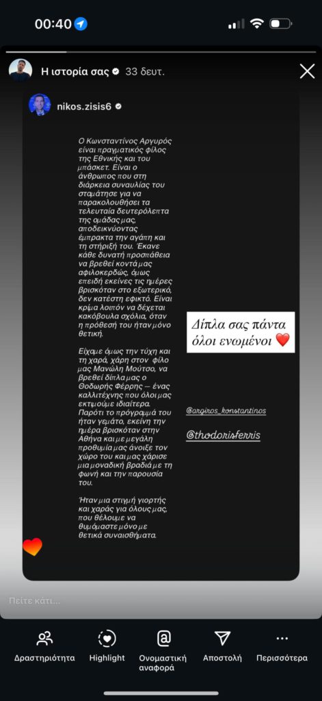 «Ο Κωνσταντίνος Αργυρός είναι πραγματικός φίλος της Εθνικής και του μπάσκετ. Είναι ο άνθρωπος που στη διάρκεια της συναυλίας του σταμάτησε για να παρακολουθήσει τα τελευταία δευτερόλεπτα της ομάδας μας αποδεικνύοντας έμπρακτα την αγάπη και τη στήριξή του. Έκανε κάθε δυνατή προσπάθεια να βρεθεί κοντά μας αφιλοκερδώς, όμως επειδή εκείνες της ημέρες βρισκόταν στο εξωτερικό, δεν κατέστη εφικτό. Είναι κρίμα λοιπόν να δέχεται κακόβουλα σχόλια όταν η πρόθεσή του ήταν μόνο θετική.